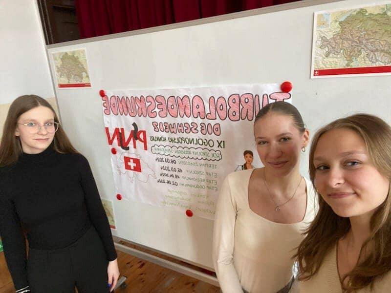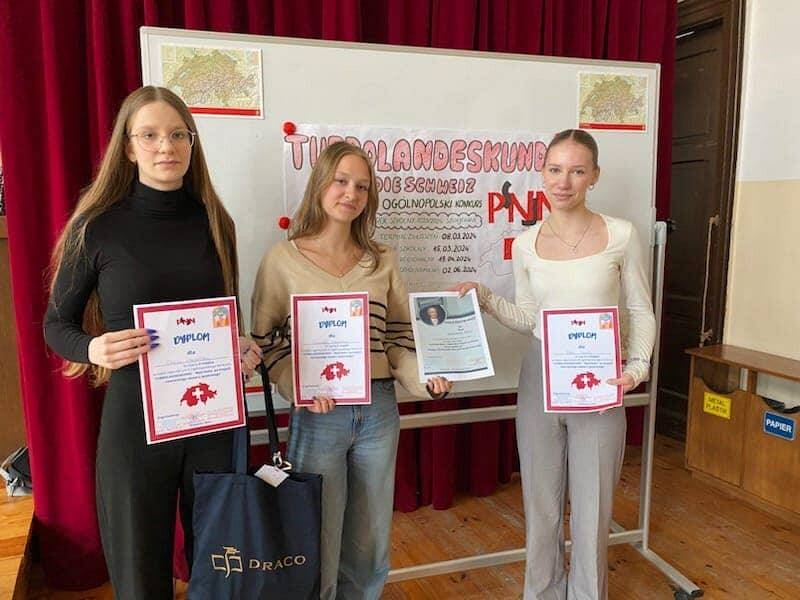 Ola Dankowska, Wiktoria Dawidowska, and Nadia Szauła returned from Gdańsk with diplomas for placing second in the provincial stage of the 9th edition of the Turbolandeskunde competition. They demonstrated extensive knowledge in the fields of culture, art, politics, literature, history, and geography of Switzerland.