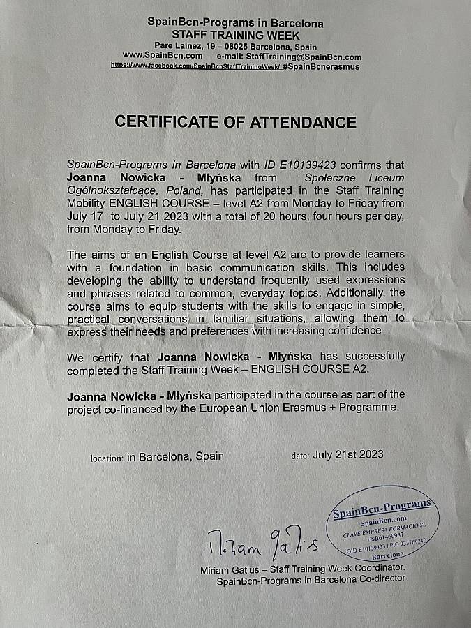 W dniach 17.-21.07.2023 nauczyciele naszej szkoły, pani Joanna Nowicka-Młyńska oraz pani Katarzyna Wróblewska-Kurzydło uczestniczyły w kursie języka angielskiego w Barcelonie.